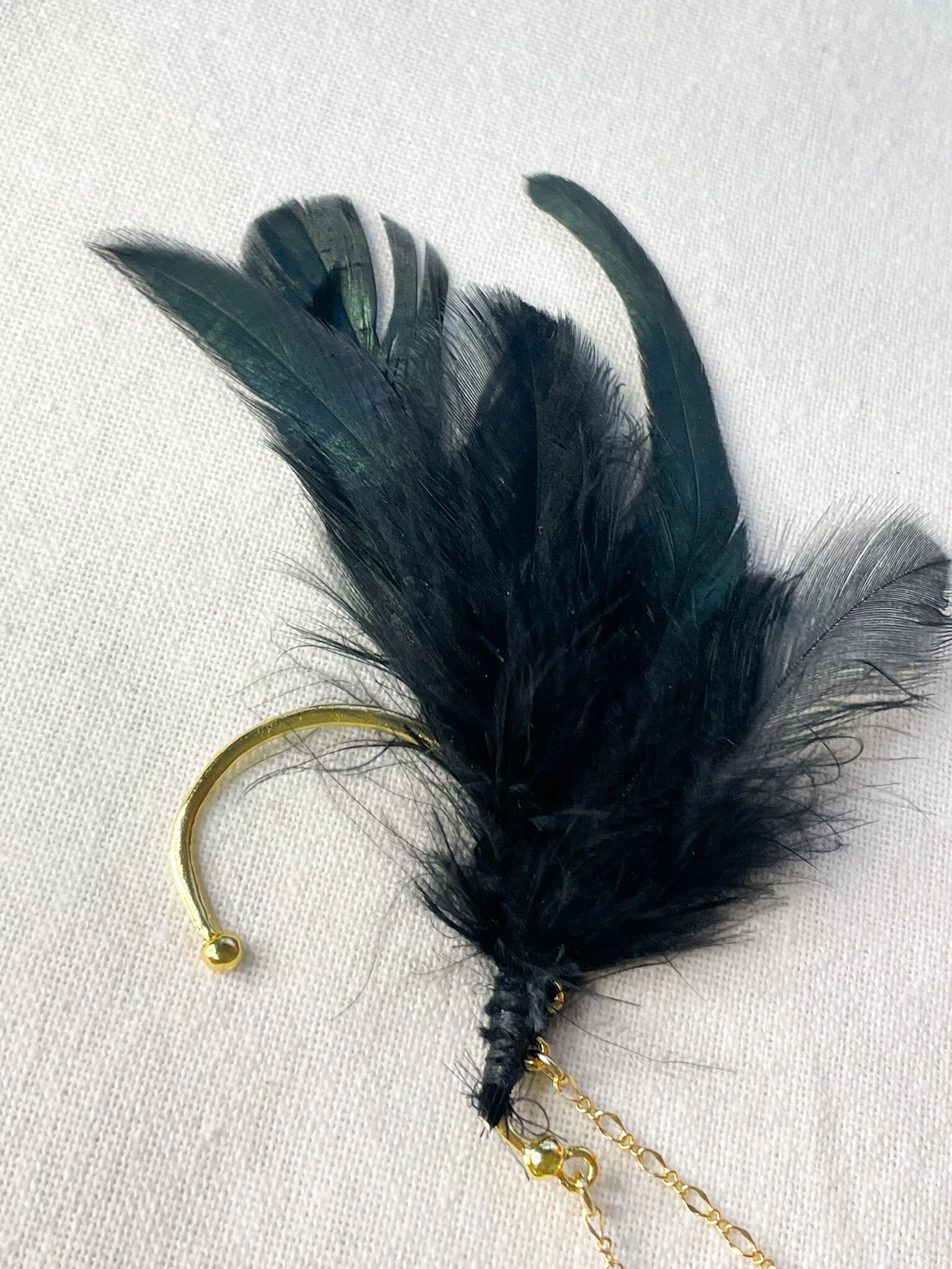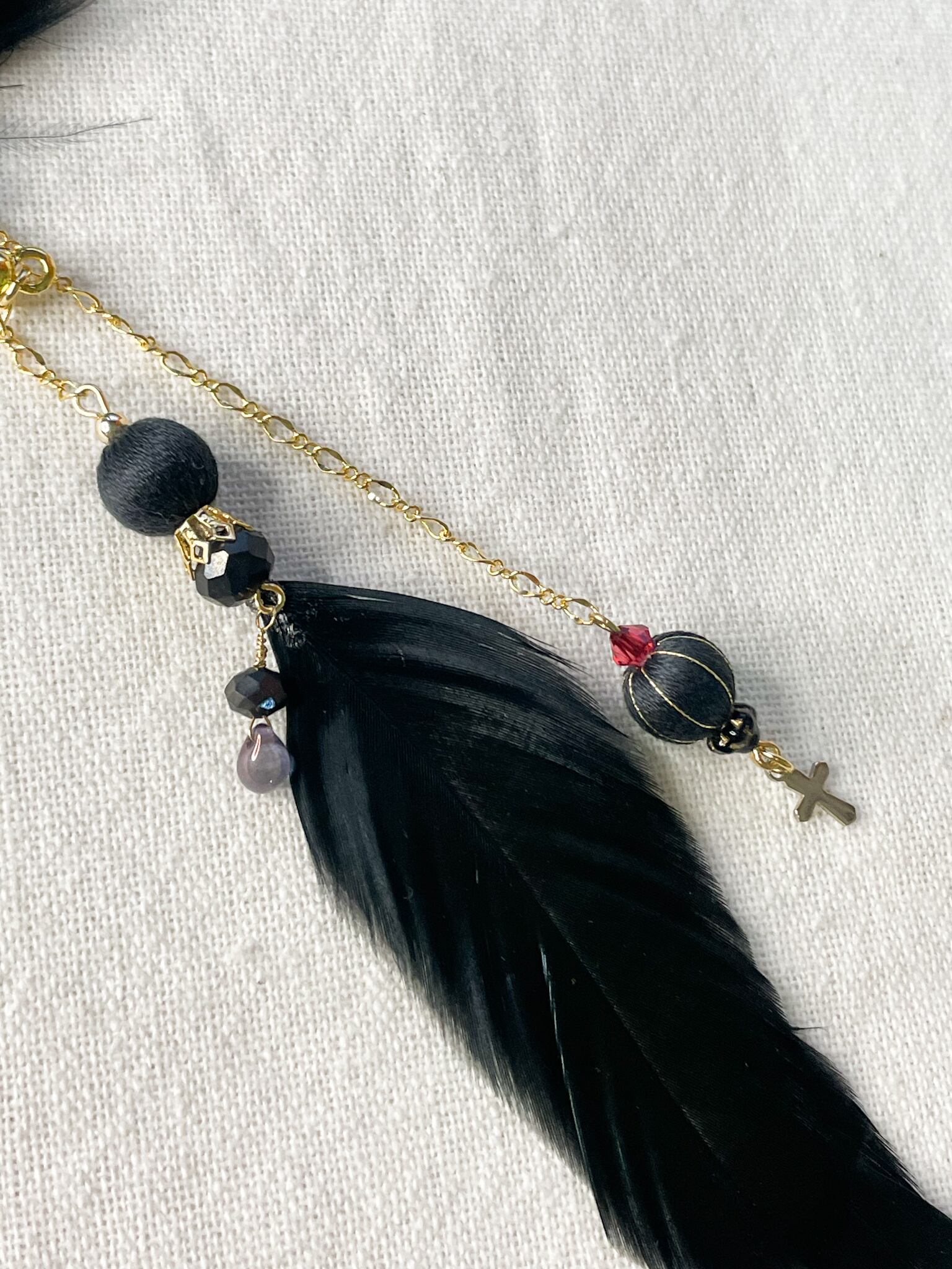 ウッドビーズ、刺繍糸、合金、黒羽根、クリスタルビーズ